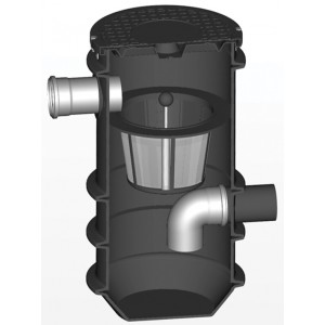 Pozzetto con filtro che pulisce l'acqua prima che fluisca nel serbatoio. Una griglia di acciaio viene inserita nel vano di plastica per separare foglie e rami dall'acqua prima che entri nel serbatoio. Il filtro è chiuso con un coperchio di plastica. È disponibile in due dimensioni.(6592)
